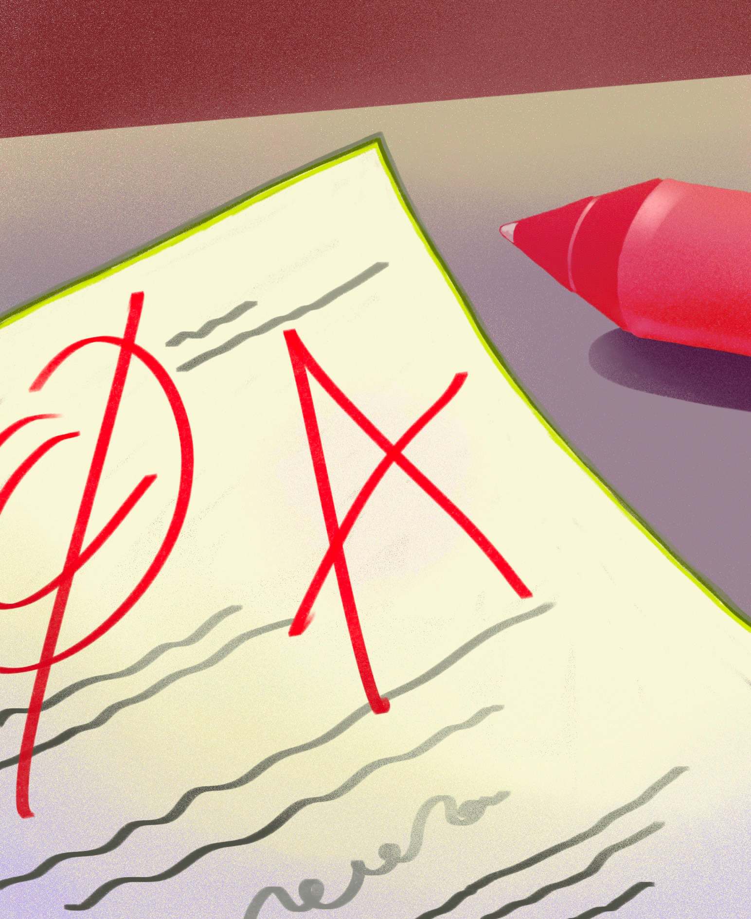 Blurb: Graded exam with points marked off and a "C" crossed out with an "A" written over it
