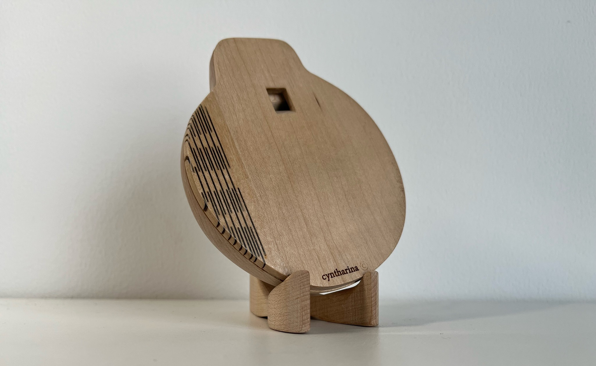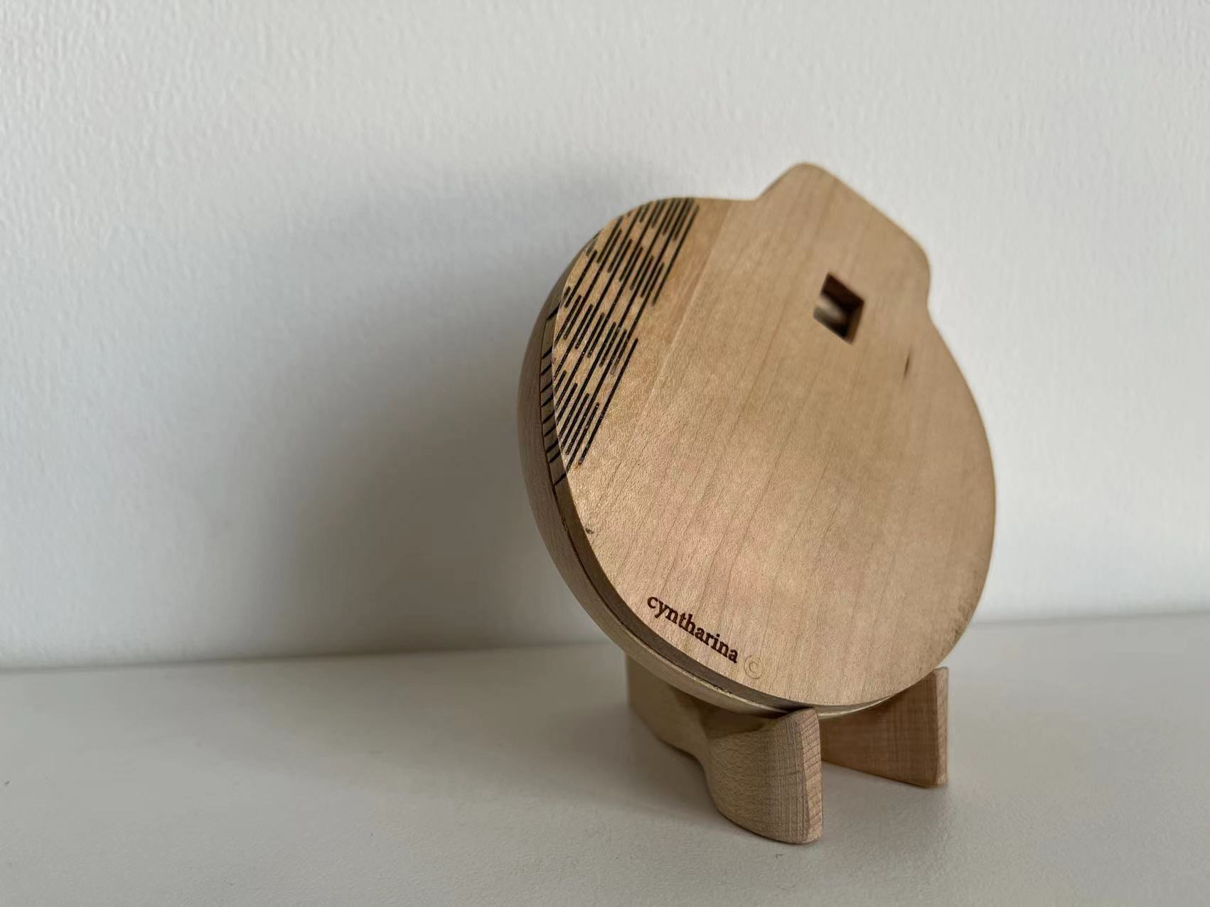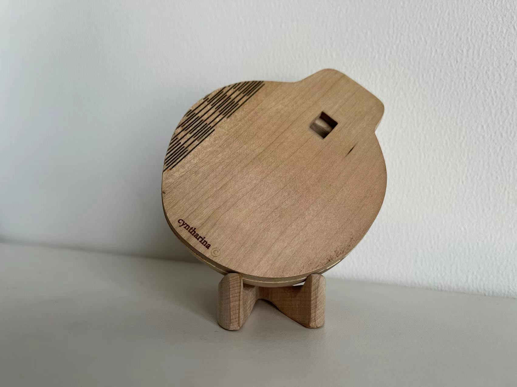 Using laser cut to make bendable wood felt like a good opportunity to add some extra flair, so I added the instrument's name and a faint copyright sign (not really knowing what that meant at the time). I also decided to make a quick stand for the instrument with some leftover wood. While the bandwidth of the bendable part of the wood isn't big, the range of the notes is surprisingly big.
