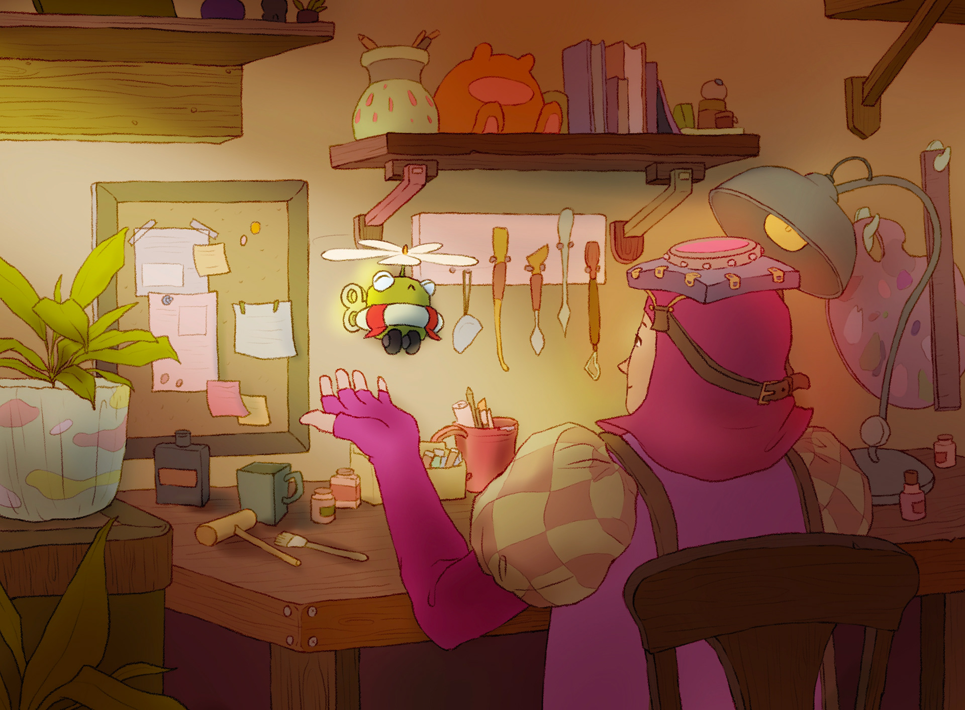 Priscilla is a gifted toymaker, descendent of a great magician, though she doesn’t know of her family history. Her toys are highly sought after because they become sentient once she determines them finished. After receiving a heartwarming letter from a young boy, she begins making him this froggy commission. Froggy is special in that he is the most alive toy she’s ever made, and while he really likes Priscilla, she finds his constant presence annoying.