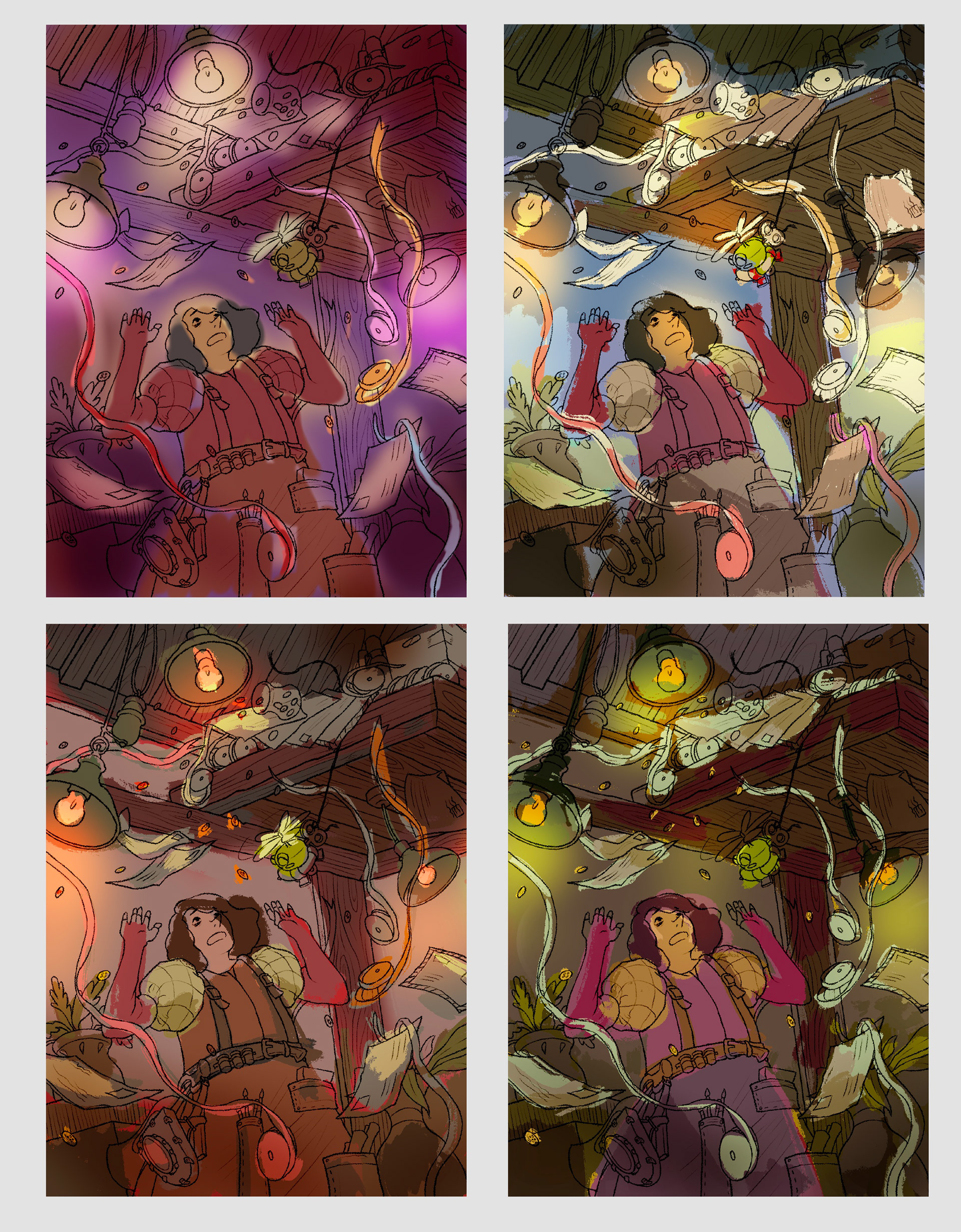 For the last illustration, I wanted to create a more complicated scene with lots of motion. The characters' relationship goes through stages throughout the story, and this moment shows the catalyst to their relationship. While Froggy messes around, making a mess of things without realizing it, he swings down to say hi to Priscilla while Priscilla is in shock by the mess about to rain down on them.