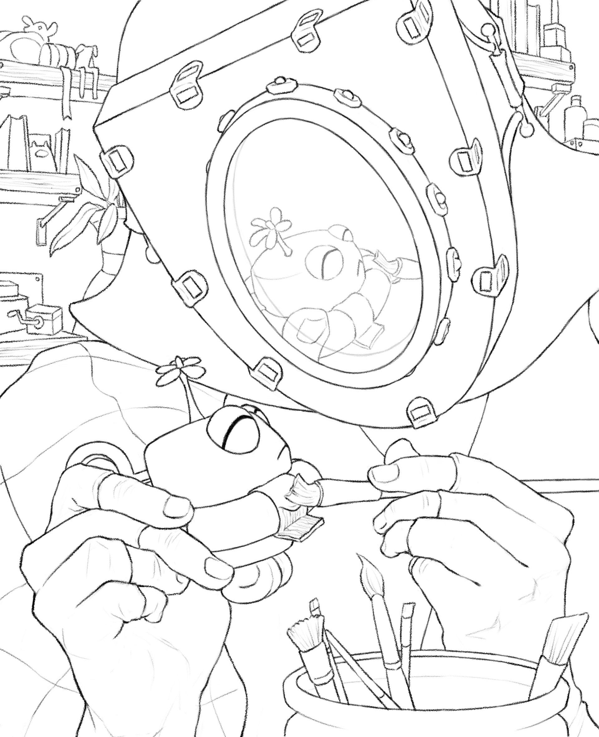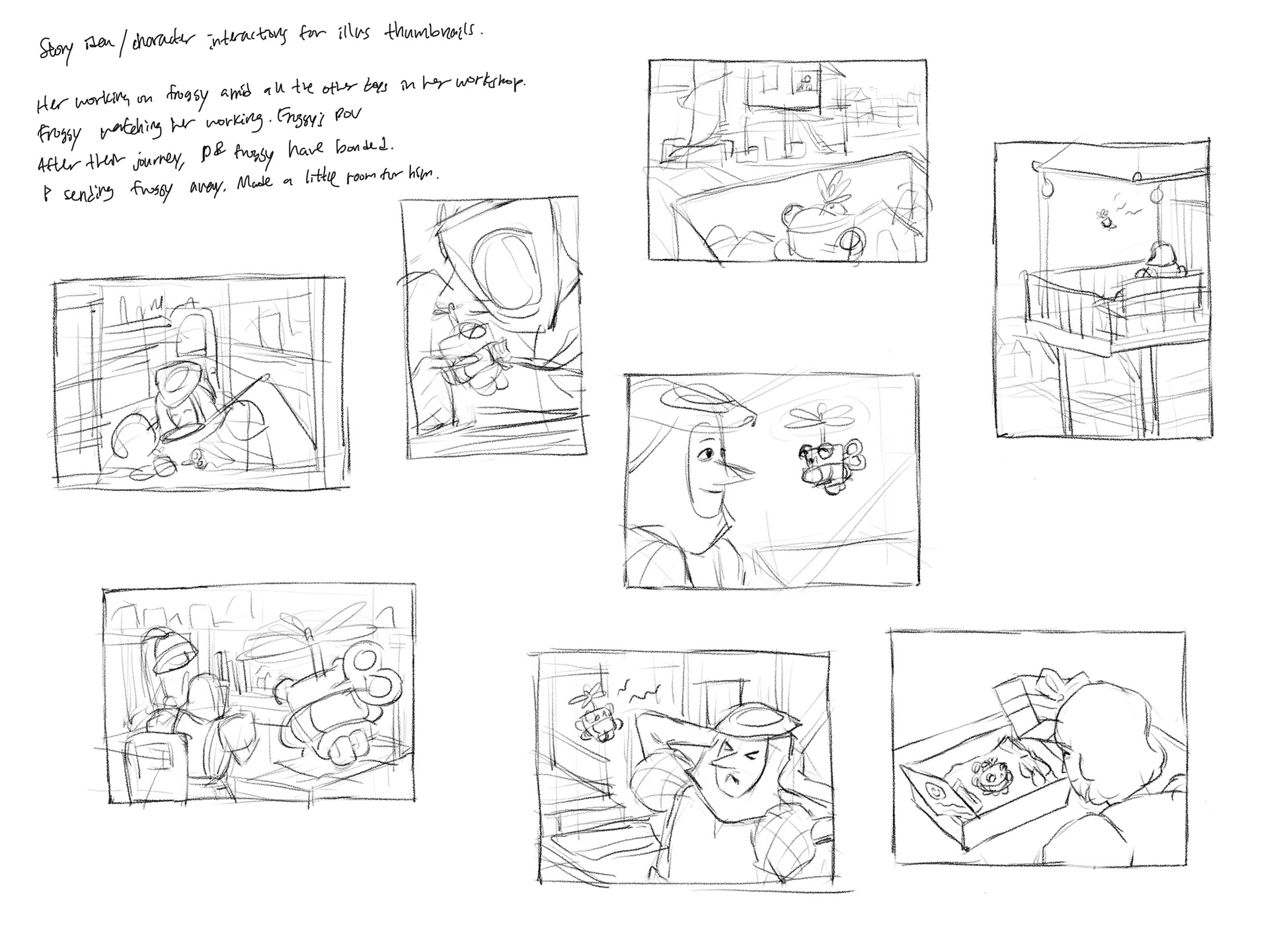 I wanted to create an intimate close-up illustration of Priscilla first creating Froggy, showing her gentle and caring nature, and begin building their relationship before Froggy was even awake yet.